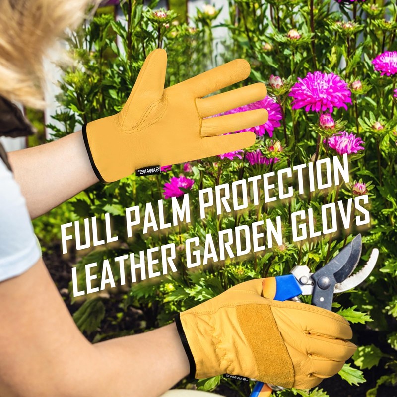 SAWANS Leather Working Gardening Gloves for Men Women Thorn Proof Comfortable Breathable Multi-Purpose Work Gloves Protective Garden Gloves Heavy Duty Utility Gripper (Yellow, L)