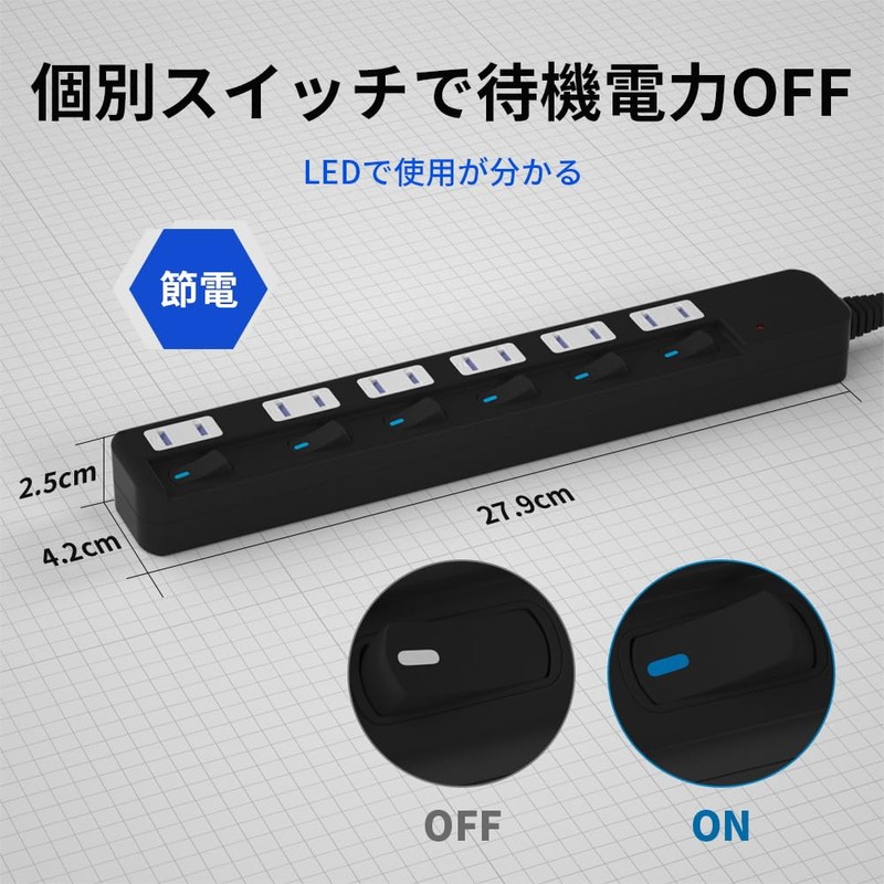 SAYBOUR Power Strip, Lightning Guard, Individual Switch, Power Saving Tap, Stylish, Energy Saving, AC Outlet, 6 LEDs, PSE Certified, Extension Cord (3 m, Black)