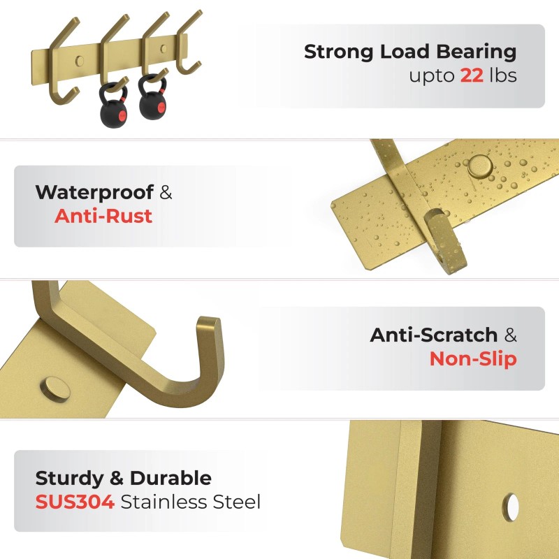 SAYONEYES Brushed Gold Coat Rack Wall Mount with 4 Double Hooks for Hanging –...