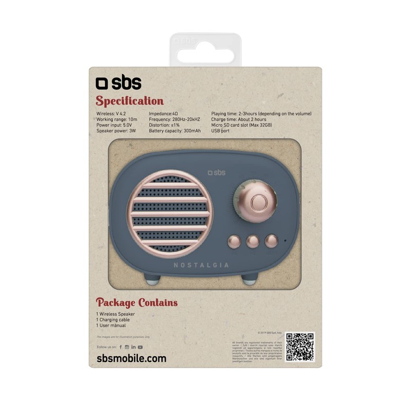 SBS Wireless Speaker 3W Sanremo - Portable V 4.2 Bluetooth Retro Speaker, 3 Watt, 300 mAh, Slot for Micro SD Card, Socket Input 3.5 mm, Input for USB, Runtime: 2/3 Hours
