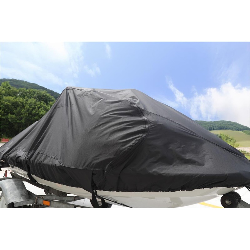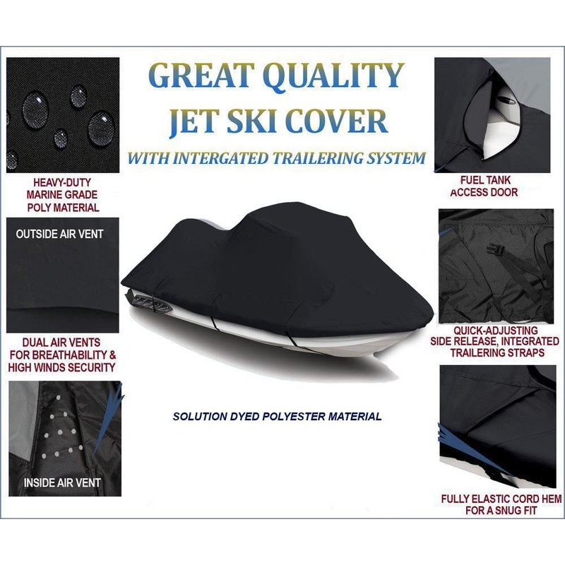 - Personal WaterCraft wrap with all the right features: (1) Thick elasticized shock-cord encased in the hem to keep the cover snug and tight against the jet ski; (2) Three tension panel trailering straps for added security when traveling; (3) Dual Rear Air Vents prevent wind lofting when trailering on the road, and also provide an escape for trapped moisture during storage use; (4) Dual interior access flaps, one on each side. Opening for trailer hook in the front. Semi-Custom Style design.