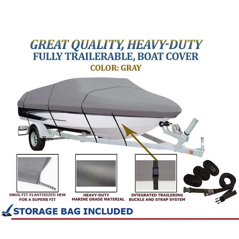 - Trailerable grey cover for boats features: Defensive Stress Points waterproof polyester Reinforcements materials- Non-Scratch Reinforcements, Fully Elastic Bungee Cord in Hem Around the Bottom For a Semi Custom Fit. Integrated Buckle and Strap System for an Easy Fitting and Trailering. Waterproof Air Vents to Prevent Wind Lofting and Allow Air Circulation.