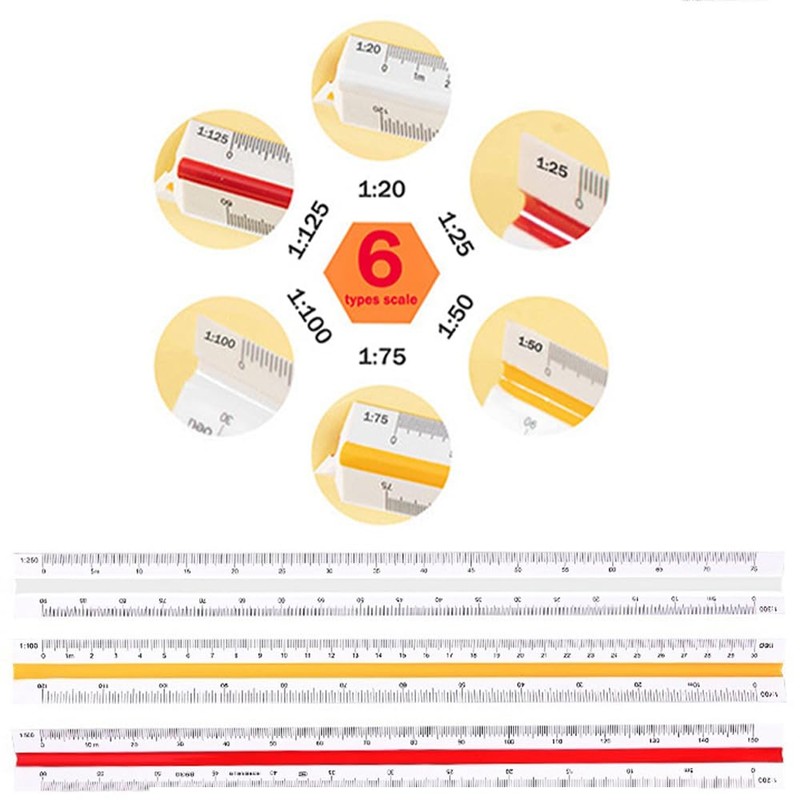 - Different scales: You will receive a triangular scale ruler, each six rulers: 1:20, 1:25, 1:50, 1:75, 1:100, 1:125.