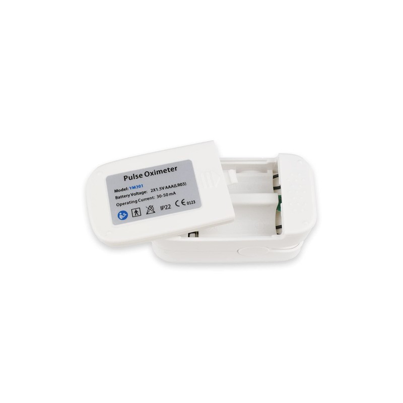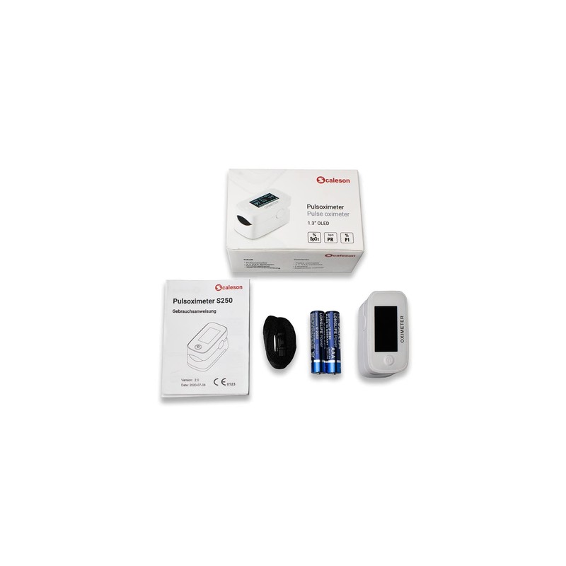 - Box contents: 1 x pulse oximeter, 1 x lanyard, 2 x AAA batteries, 1 x user manual.