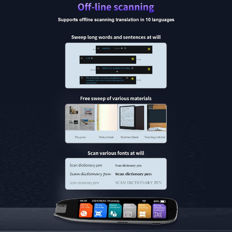 • Offline Translation: This dictionary pen supports offline scanning and translation, suitable for situations without a network, and has powerful Chinese English electronic dictionary function, making English learning convenient; 820mAh large capacity battery, supporting up to 8 hours of continuous work and 7 days of standby time