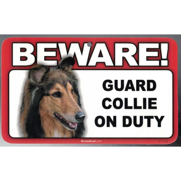 SCANDICAL BEWARE GUARD COLLIE DOG ON DUTY 5" X 8" HANGABLE PLASTIC SIGN NEW