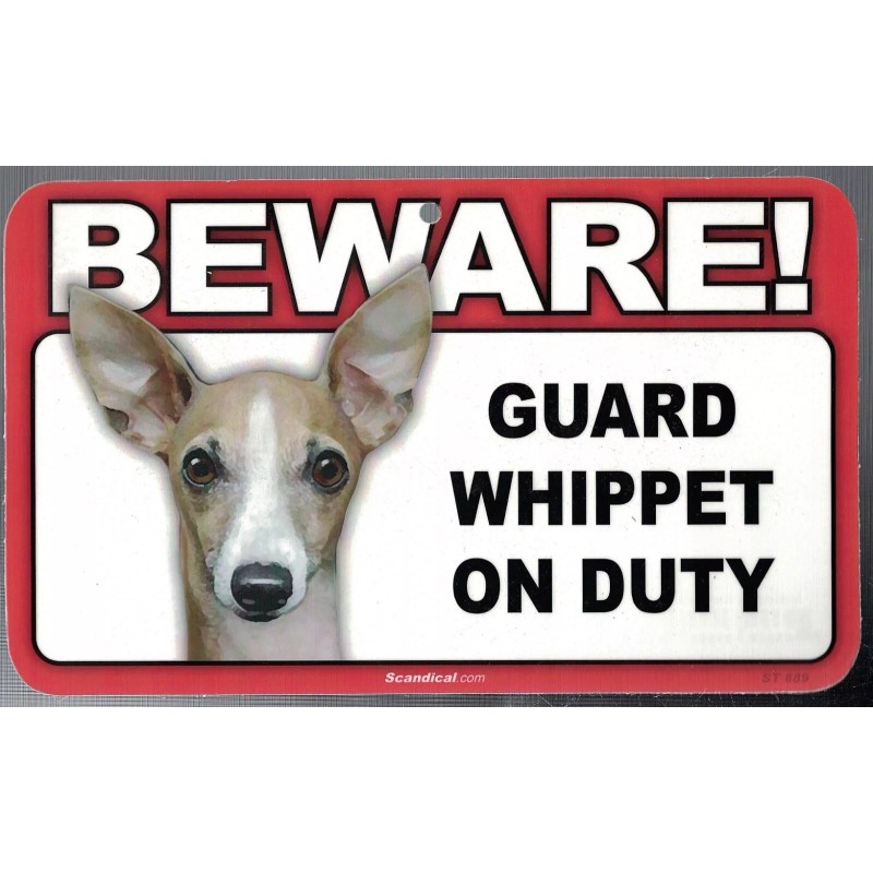 SCANDICAL BEWARE GUARD WHIPPET DOG ON DUTY 5" X 8" HANGABLE PLASTIC SIGN NEW