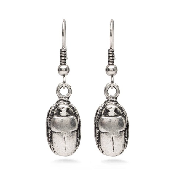 - These Egyptian scarab earrings are 1.75 inches long. We use antique silver plated pewter for a beautiful, long-lasting finish.