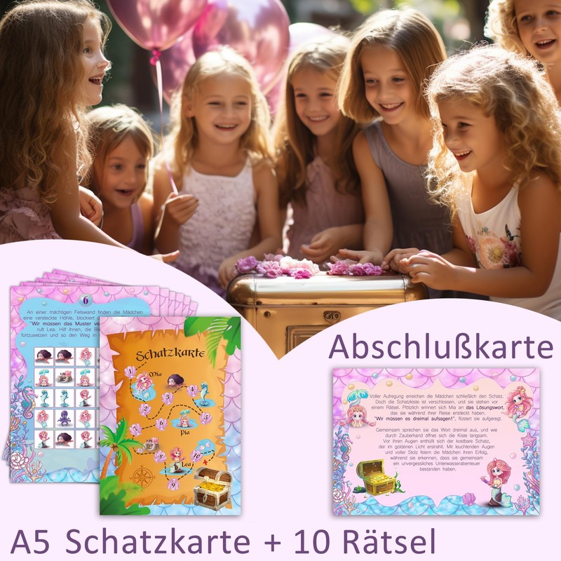 - Design: Immerse yourself in an enchanting design in purple, blue and pink tones. With beautiful underwater motifs and a variety of sea creatures, your party will be an eye-catcher. The three main characters - our lovely mermaids - lead through the scavenger hunt and make the experience unforgettable.