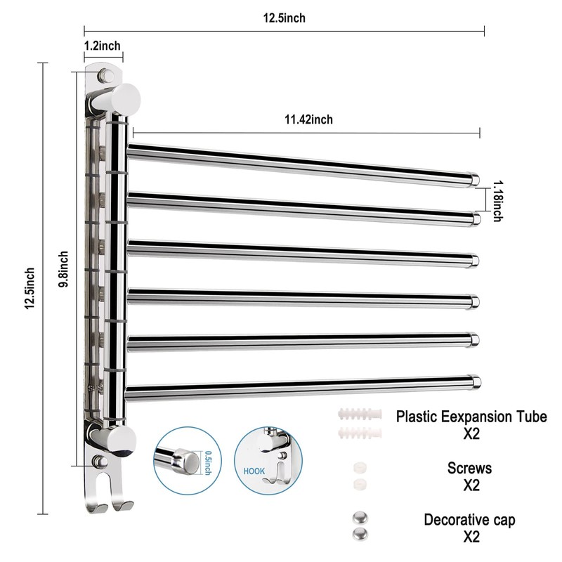 SCDGRW swivel towel rack is 6-arm towel bar, which can save more space and has enough space to hand the bath things, it will meet your all needs. Suitable for bathroom and hotel.