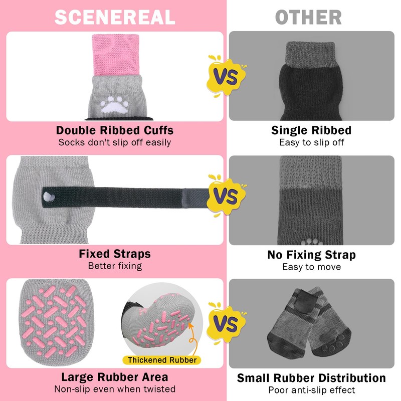 - DOUBLE SIDED NON-SLIP DOG PAW SOCKS: Each side of the sock is grippy and the larger rubber distribution provides extra traction for your dog when walking on smooth floors. Even if the sock is twisted, it will still work fine. In addition, the double-sided grip ensures that the socks last longer. When the grip on one side wears out and there is no anti-slip effect, it allows the dog to wear the other side of the grip and exert a new anti-slip effect.