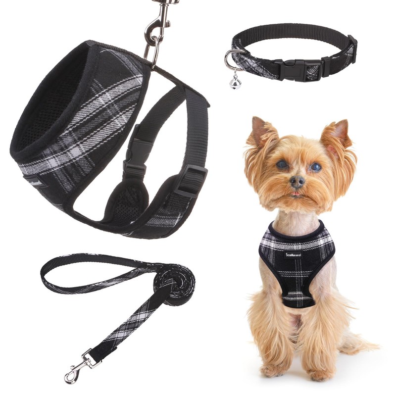 SCENEREAL No Pull Dog Harness Collar and Leash Set Small Medium Sized Dog, Soft Mesh Step in Puppy Harnesses, No Chock Plaid Adjustible Pet Vest for Outdoor Walking Training and Running, Black S