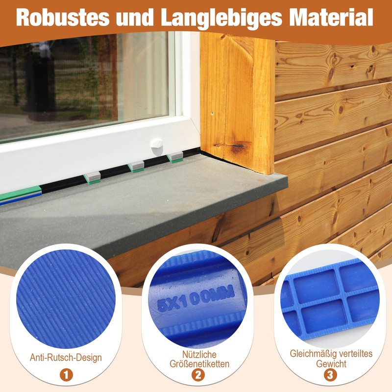 - Versatile: the underlay plates are not only suitable for leveling joints and levelling doors and windows during assembly, but can also be used for attaching wall tiles, lifting floors and building patios. They are a practical tool for quick and precise installation