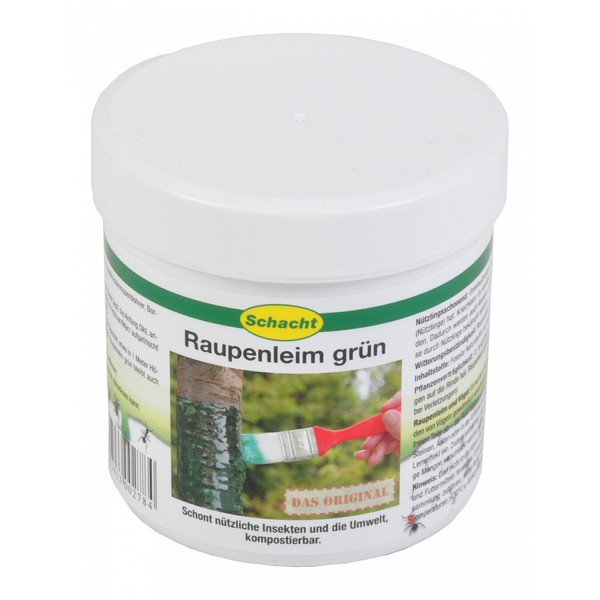 - Green-coloured caterpillar glue for direct application to the tree trunk, for post-treatment of glue rings and - in conjunction with the caterpillar glue belt paper - for self-making of glue rings.