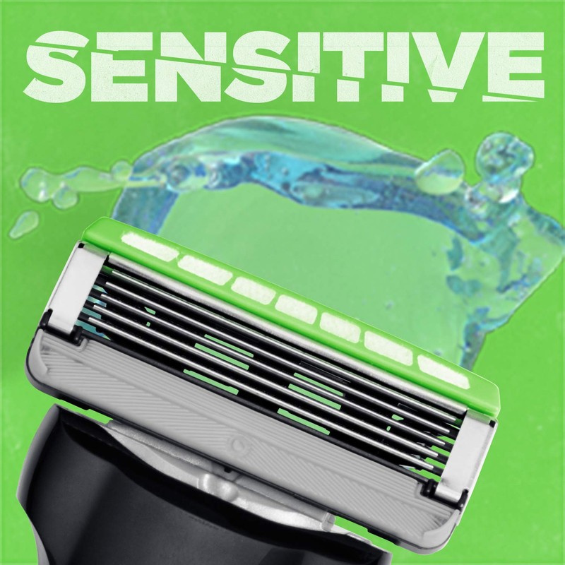 - Our Sensitive gel formula, with Herbal Extracts, comforts skin while our 5 ultra-glide blades with skin guards protects you from irritation