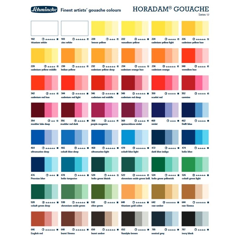 - Application: Horadam Gouache is ready to use directly and with water and of course can be mixed and combined with all other gouache varieties from Schmincke It dries matt and becomes slightly lighter in colour. For all absorbent surfaces, such as paper, cardboard or primed canvas, also perfect as an underpainting for oil paintings.
