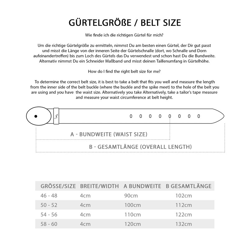 - Measuring the belt: the Franco leather belt has a width of 4 cm and the Austria belt buckle is 6 x 8 cm. Loosely place a tape measure around your waistband and measure your circumference, this shows the required belt length. Please also refer to the measurement chart in the pictures.
