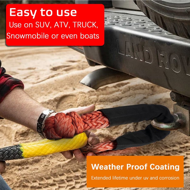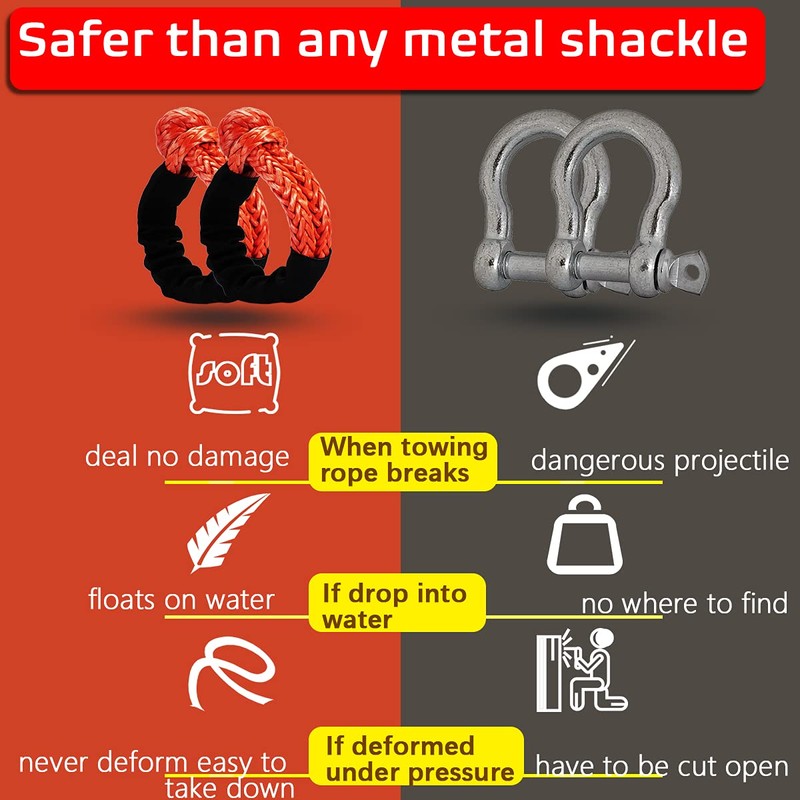 - ใ๐๐ข๐ ๐ก๐ญ๐ฐ๐๐ข๐ ๐ก๐ญ=๐๐๐๐ใโโ Weights only 7 ounces for each shackle compared to bulky old metal shackles. These lightweight sythetic soft shackles will do no damage to car or people if the towing rope accidently breaks and throws shackles to car. That's why soft shackles are becoming this popular.