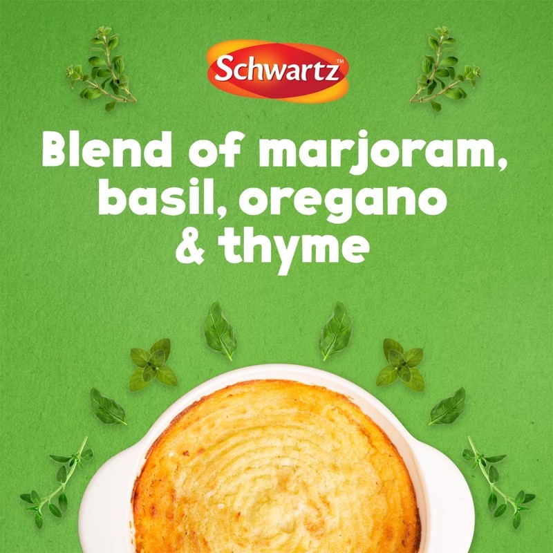 - SCHWARTZ DRIED MIXED HERBS: Ideal for stews, freshly grilled fish, pasta, dips, dressings and more. Add hefty shake at the beginning of the cooking process to get a full Mediterranean flavour