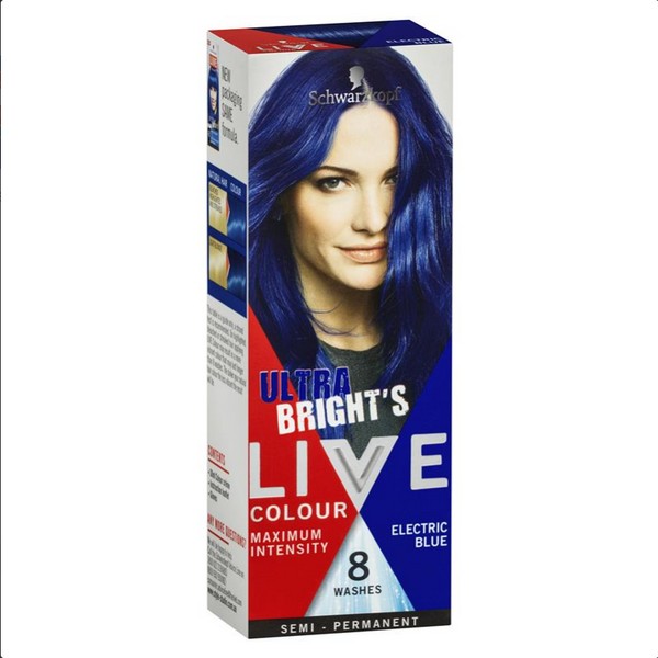 Schwarzkopf Live Colour Ultra Bright Electric Blue for maximum intensity and vibrancy. Has built in electrifying pigments and has no ammonia. Semi- permanent.