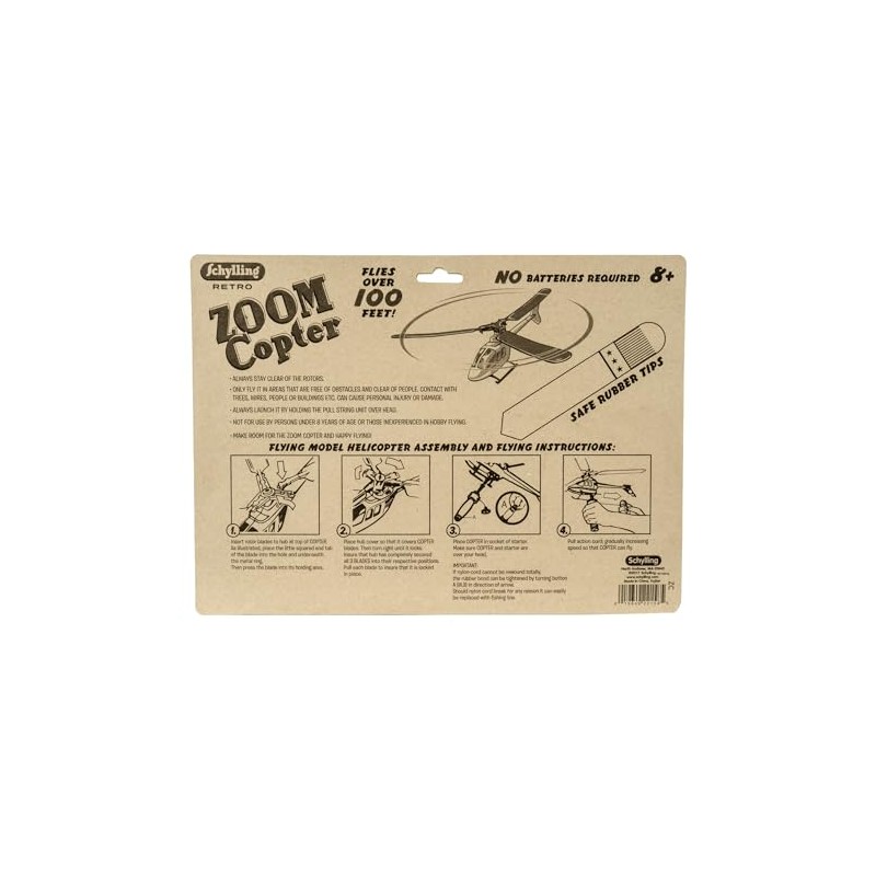 The Zoom Copter, high performance flight operations in the palm of your hand, from Schylling Toys the world leader in traditional toys and classic fun. This fantastic back yard flyer can fly over 100 feet with a simple pull of the action cord. The harder and faster you pull the cord, the higher it will fly. Made of durable plastic and with soft rubber tipped blades for increased safety, the Zoom Copter is hours of back yard fun. For ages 8+.