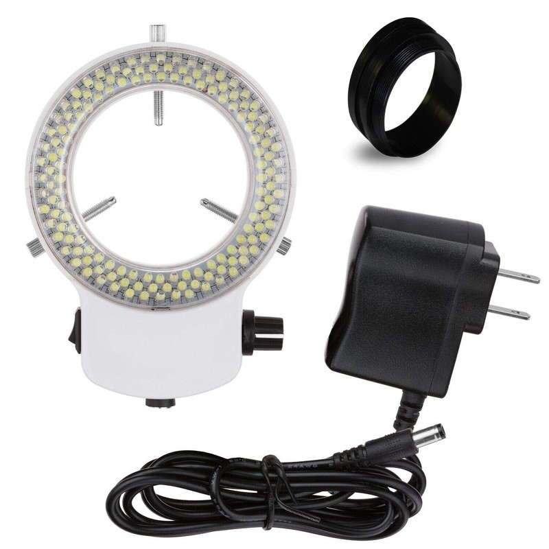 144-LED intensity adjustable ring light for stereo microscopes with mounting size 2.4" (61mm) in diameter. The ring light has 2.5" (62.5mm) inside and 3.64" (92.5mm) overall outside diameters. It works with power supplies from a 100-240V and comes with a 1-7/8" (48 mm in diameter) ring adapter. With variable intensity control, it provides cool, even, intense and focused shadow-free illumination. It is an ideal durable cool light source for all stereo microscopes.