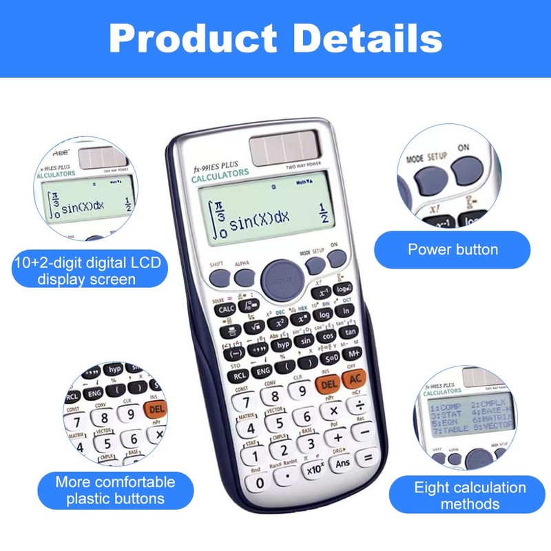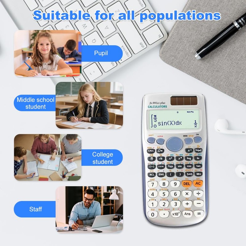 - Compact and Durable: The scientific calculator is constructed from high-quality materials, ensuring exceptional durability and long-lasting performance. Its design combines aesthetics with practicality, featuring a matte silver front panel and a blue back. Its compact and lightweight design makes it easy to carry around and use anywhere. Its scratch-resistant construction and soft-touch buttons provide a comfortable operating experience.