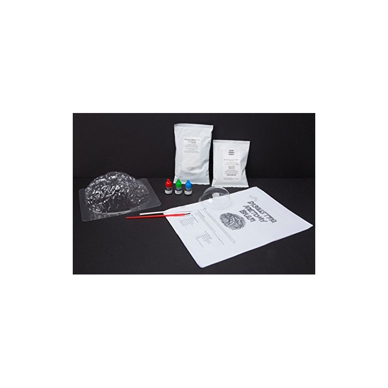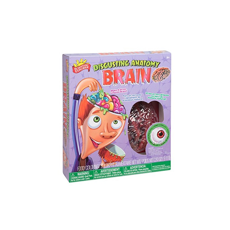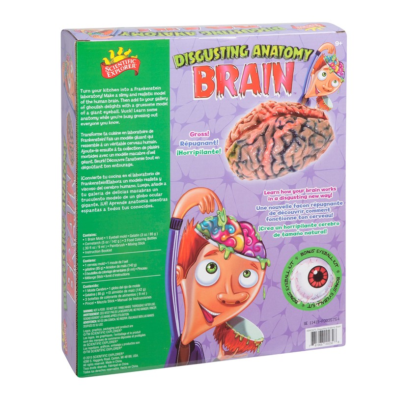- Includes a brain mold, an eyeball mold, gelatin, cornstarch, 3 food coloring bottles, paintbrush, mixing stick and instructions
