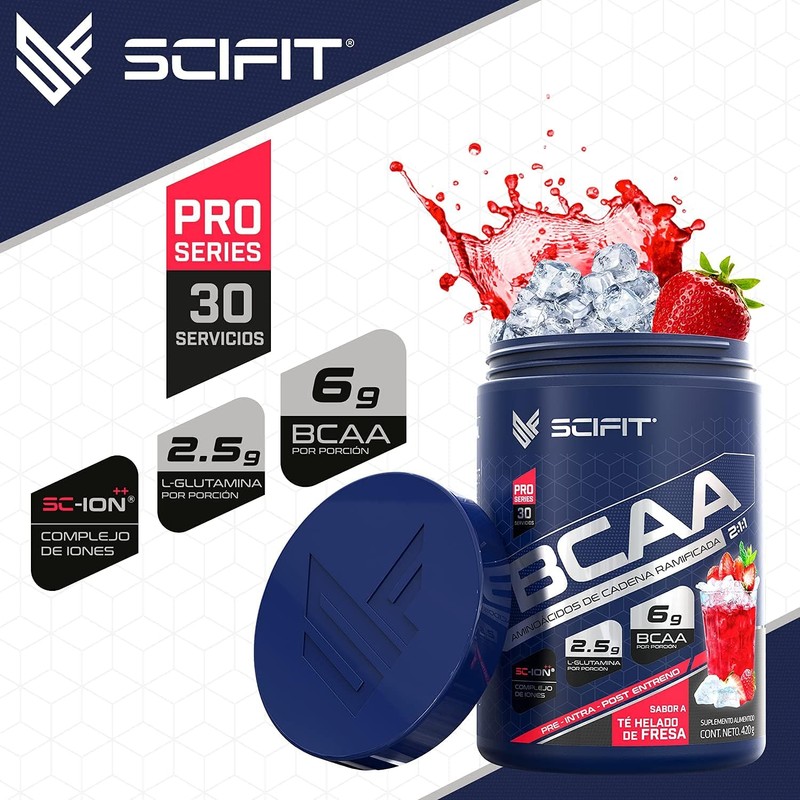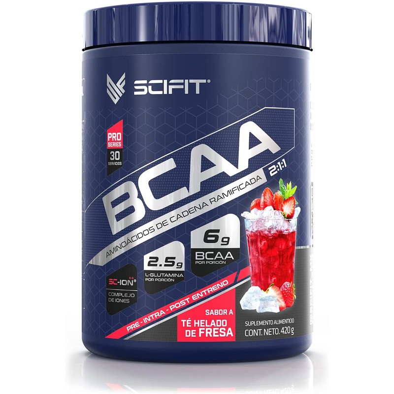 Scifit | Aminoácidos BCAA | 6 g de BCAA 2:1:1 | 2.5 g de L-Glutamina | 30 Servicios | Sabor Te de Fresa | Post-Intra Entrenamiento | Con Complejo de Hidratación SC-ION++® | 420 g