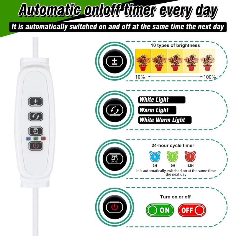 - 24-hour cycle timer: plant light LED full spectrum for indoor plants has 3 cycle time settings where it remains on for 3/9/12 hours. Full spectrum plant light it will automatically turn on and off at the same time the next day without having to turn it off or plug it back in. She plant grow lamp will take care of your plants while you are at work or on vacation
