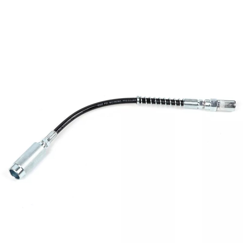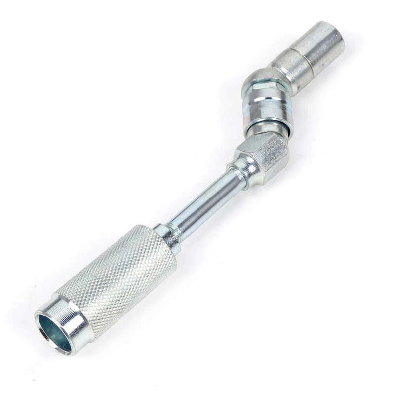 The 7pc grease gun adapter set comes with a 90 degree lube tube, straight extension, 12" hose extension, slide-on 90 degree coupler, rubber tipped nozzle, needle nozzle and a 360 degree coupler in a handy storage case.