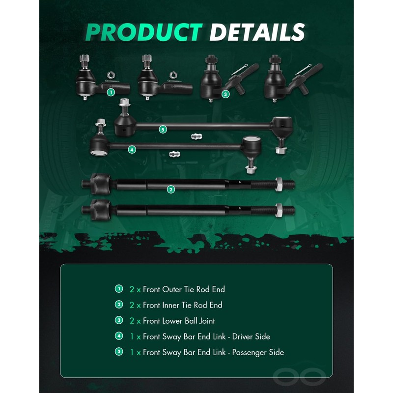 • 【Suspension Kit Include】8pc Set Suspension Parts: (2) ES3306 Front Outer Tie Rod End, (2) EV301 Front Inner Tie Rod End, (2) K9499 Front Lower Ball Joint, (1) K90311 Front Sway Bar End Link - Driver Side, (1) K90312 Front Sway Bar End Link - Passenger Side