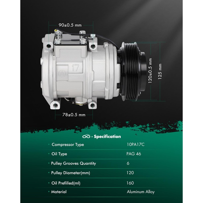 - Specifications: Compressor Type: 10PA17C; Oil Type: PAG46; Pulley Grooves Quantity: 6; Material: Aluminum Alloy; Clutch Included: Yes; Oil Prefilled: 160 ml; Pulley Diameter (mm): 12