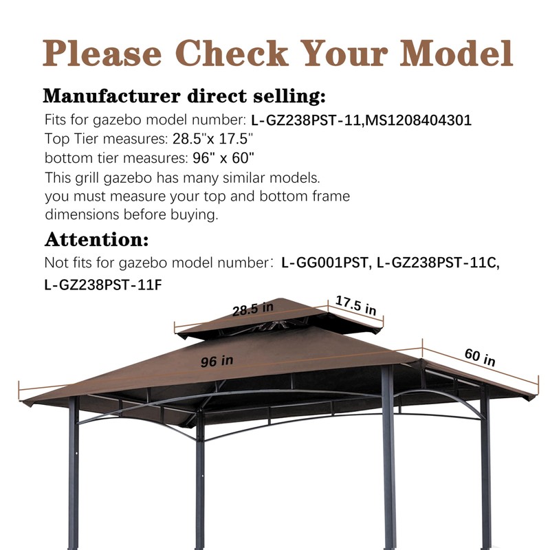 - Original Manufacturer: Designed to fit L-GG001PST-F, L-GG001PST-H,Grill Gazebo. Please measure corner to corner of the gazebo and compare to the dimensions on the listing
