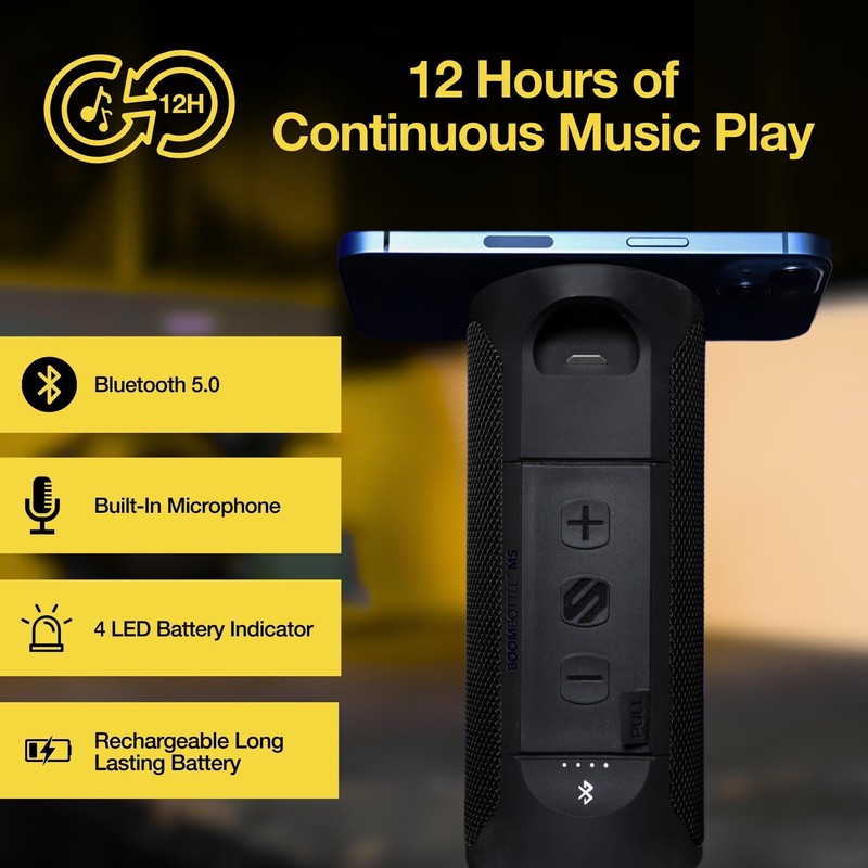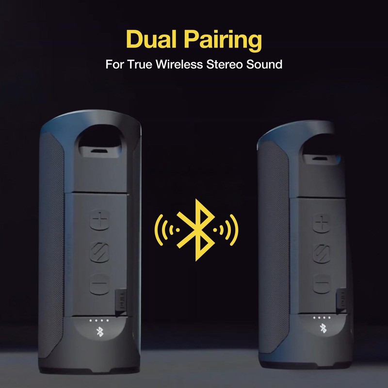 - RECHARGEABLE LONG-LASTING BATTERY: Get up to 12 hours of continuous music playback with the powerful (2000 mAh*2/14.8 Watt Hr) li-ion batteries and 4 LED indicators; Wirelessly pair two BoomBottles from up to 30 feet apart