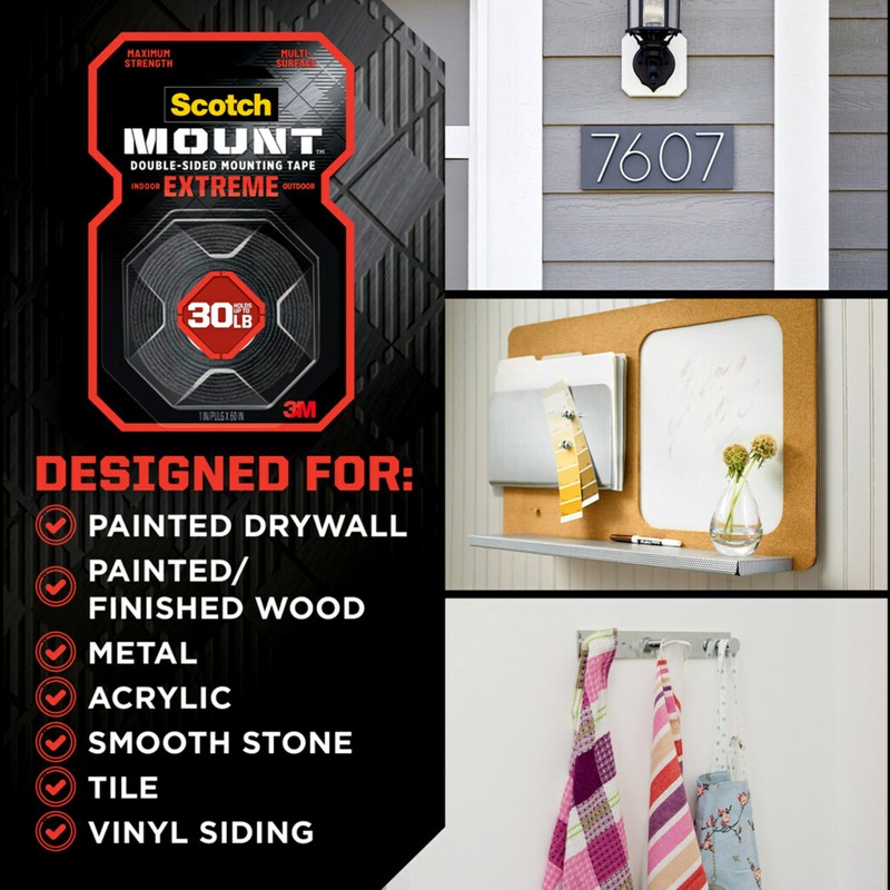 For your toughest jobs, go for our strongest holdCScotch-Mount Extreme Double-Sided Mounting Tape with its 3M industrial strength adhesive. Equipped with our powerful permanent adhesive, this double-sided tape defies gravity, holding an item up to 24 pounds. It's weather resistant for a long lasting bond, indoors and outdoors. So whether you're mounting artwork in your new apartment, or adding wall organization to the garage, Scotch-Mount Extreme Double-Sided Mounting Tape does the job quickly, easily and without the hassle of tools.