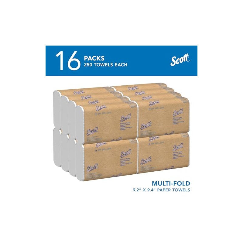 • 250 Sheets/Pack, 16 Scott Multifold Paper Towel Packs/Case; 4,000 Sheets/Case; with Absorbency Pockets; 9.2" x 9.4" sheets; White; Compact Case for Easy Storage