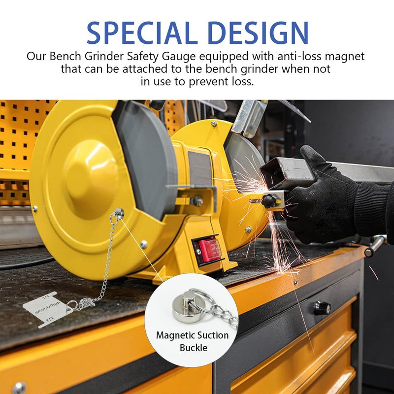 - 【SPECIAL DESIGN】Our Bench Grinder Safety Gauge equipped with anti-loss magnet that can be attached to the bench grinder when not in use to prevent loss.