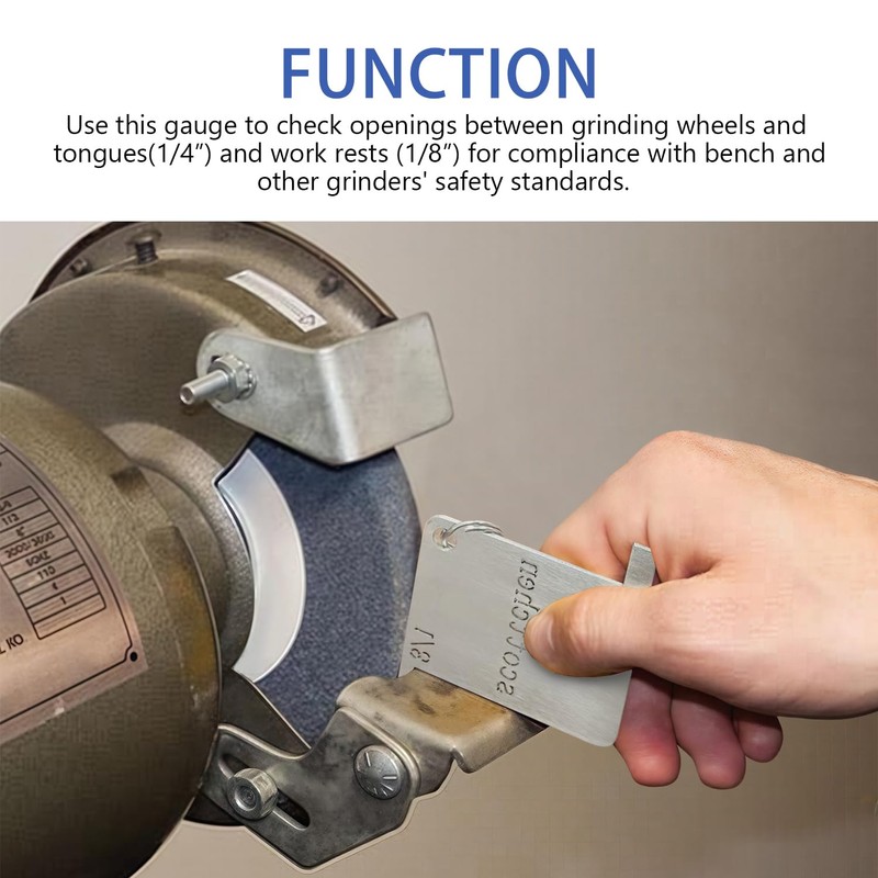 - 【FUNCTION】Use this gauge to check openings between grinding wheels and tongues(1/4”) and work rests (1/8”) for compliance with bench and other grinders' safety standards.