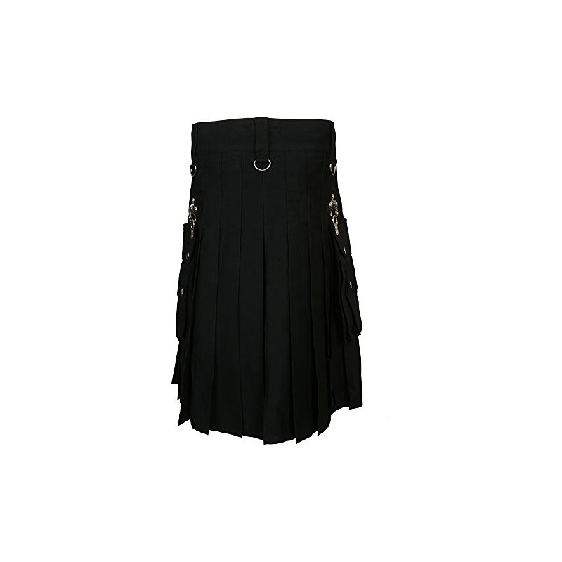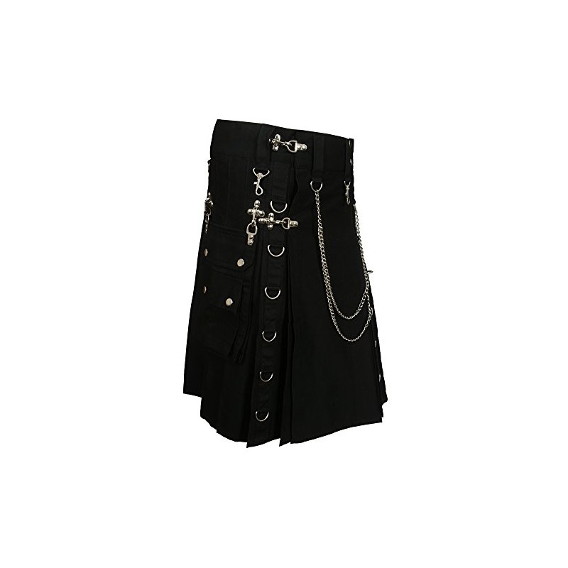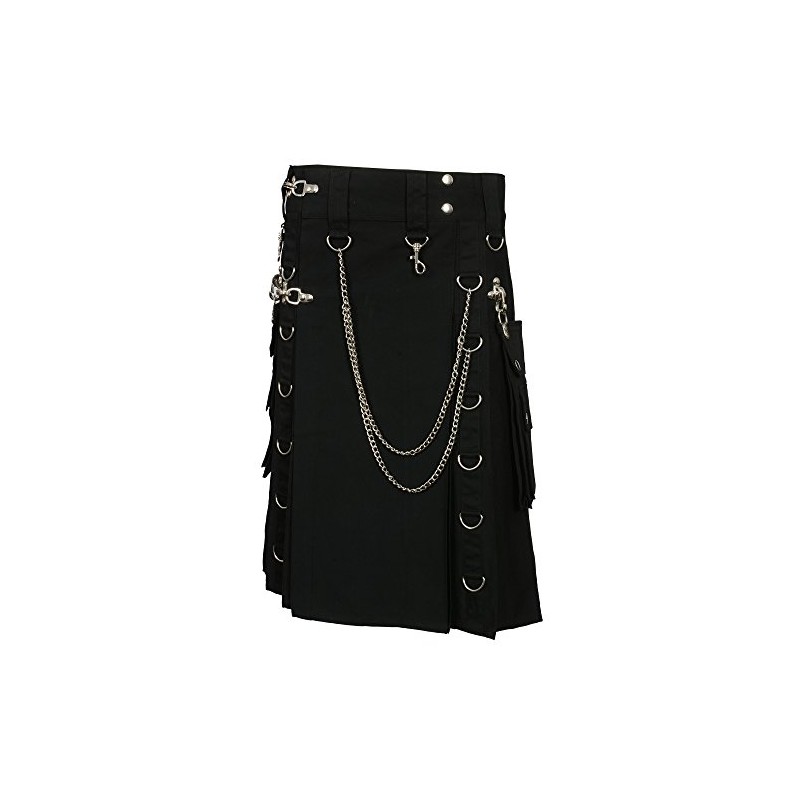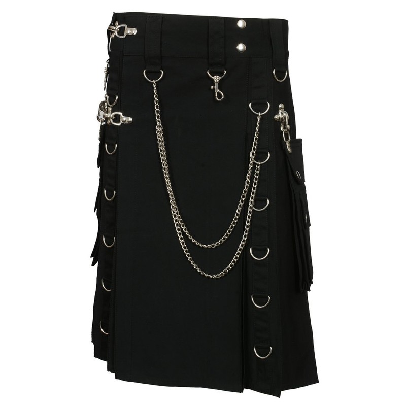 • Men Scottish Black Fashion Kilt with Beautiful Silver Chains & Long Cargo Pockets Traditional Highland kilt is very useful for Spring & Summer Wedding Parties . We use very Supreme quality of Poly Cotton which is extremely soft and comfortable especially for long hours wearing.