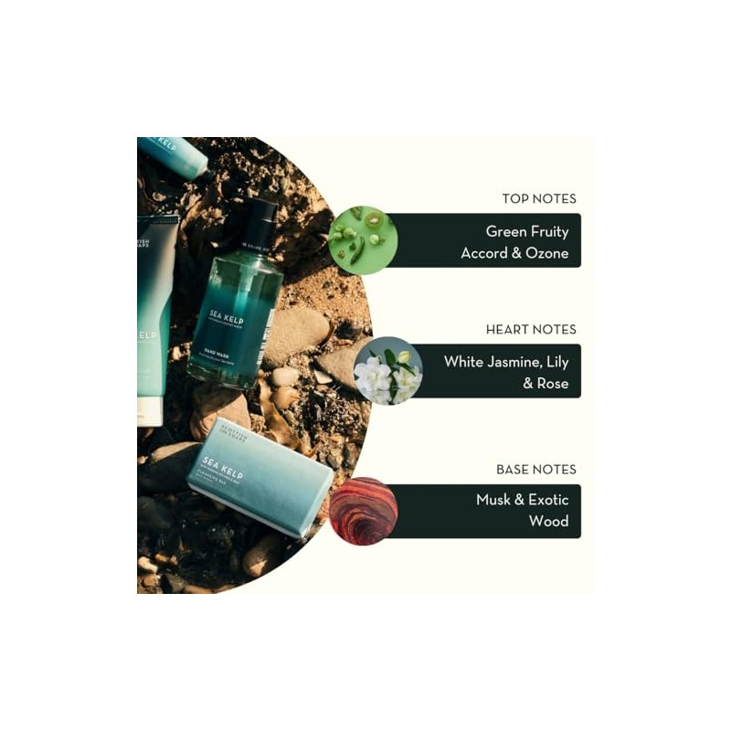 Sea Kelp has a clean and refreshing fragrance. A sea freshness that gently awakens the senses. A fresh, green fragrance with fruity top notes combined with cool, airy ozone that opens to floral heart notes of white jasmine, lily and rose. The whole thing is supported by sweet, balsamic base notes of musk and exotic wood.