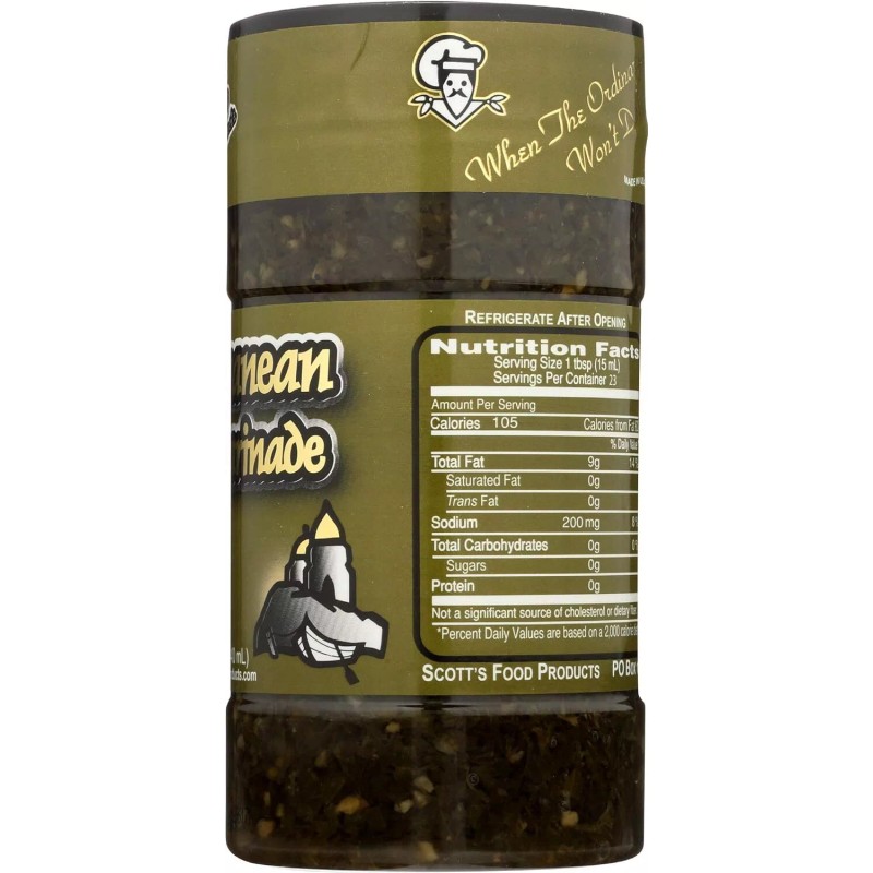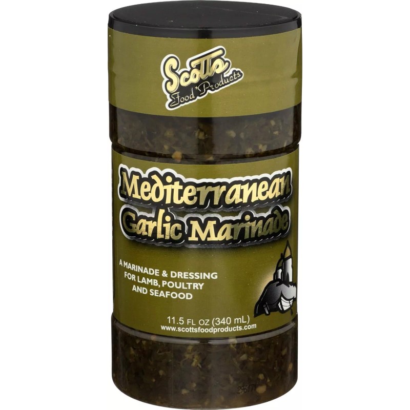 Scott's Food Products Mediterranean Garlic Marinade features a canola oil base blended with garlic and spices for a delicious addition to seafood, poultry, lamb, and vegetables. This sauce also makes a tasty salad dressing or topping for garlic bread. Each 11.5 fl. oz. container contains approximately 23 servings at 105 calories each.