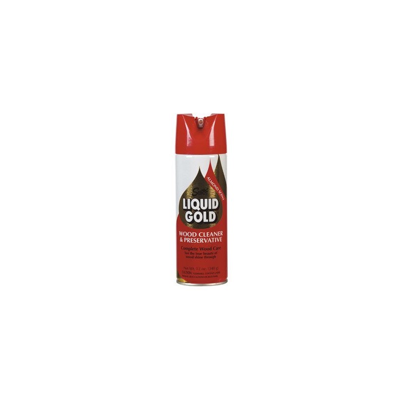 Scotts, 10 OZ, Liquid Gold Original Scented Wood Cleaner and Preservative, Aerosol, Penetrating Action Works Against Dust, Dirt, Age and Use, As Well As Drying and Cracking Caused By Heating and Air Conditioning Systems, Inhibits Warp ing, Shrinking, and Color Loss, Contains No Solids, Abrasives Or Wax To BuildUp On Surfaces To Collect Dust and Trap Imbedded Dirt and Grime, Diminishes Scratches.