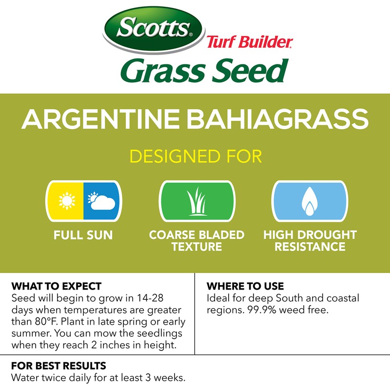 Grow a lawn that can thrive in coastal southern regions with Scotts Turf Builder Grass Seed Argentine Bahiagrass. Our 99. 9% weed-free mix will grow a lawn with excellent heat and drought resistance. Argentine bahiagrass is darker green and has a wider-blade than Pensacola bahiagrass. Additionally, the deep roots of Argentine Bahiagrass help it to be a low-maintenance lawn. Designed for full sun, coarse bladed texture and high drought resistance. Coated to absorb 2x more water than uncoated seed. Tolerates stress for lower maintenance. For best results, water twice daily for at least 3 weeks.
