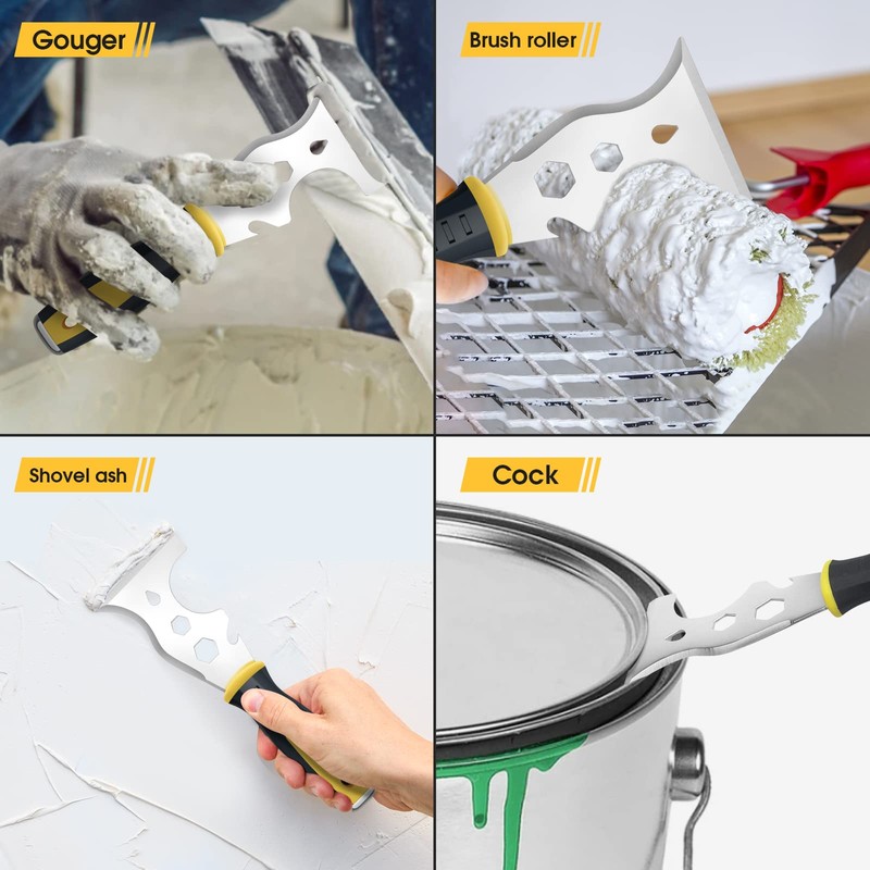 - [Multifunctional Putty Knife] - The 13-in-1 paint scraper for wood be used as a straight scraper, curved scraper, gouger, screwdriver, nail puller, can opener, hammer, roller cleaner, box opener, Allen wrench & more. The scrapers-painting & decorating tools replace multiple hand tools in your toolbox