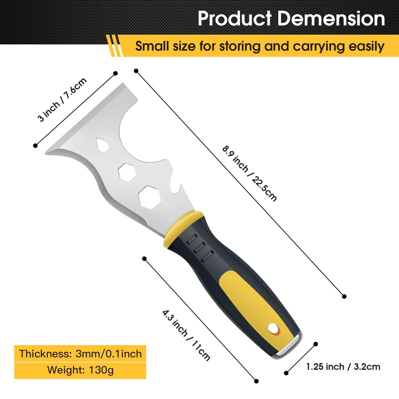 - [Ergonomic Design] - There is a metal hammer cap on end of handle. Hallow design on the handle for easy storage. This multi tool scraper is equipped with a large rubber handle gives you a comfortable edge to grasp, and let you work with minimal effort