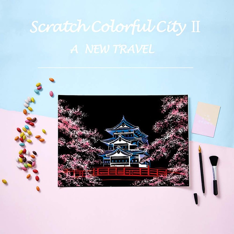 **Material:** Paper **Scratch Art Paper Size:** 11.6 x 8.3 inch (A4) **Contents:** **8 x Scratch Drawing Board** **1 x Black Scratch Pen** (gold tip is for outline drawing, Tiny tip is for detailing drawing) **1 x Clean Brush** (Clean up the scraped powder) **2 x Wood Stylus Stick** (Used to scratch the black surface) **Looking for a perfect gift for kids both boys and girls in the arts and crafts category?** **This beautiful Scratch Paper Art set is what you need.** Our Scratch Paper Art Set comes in a perfect size that allows children to play without any messes in the house or in the classroom. Scratch art sets are screen-free gaming options that bring out the creative side of your kids both in the house and out of the house. **With Scratch Art, You Can :** \- Relive your favorite travel memories by drawing an entire city view. \- Preserve memories of beautiful night views without struggling with camera. \- Give one-of-a-kind gift for travelers, explorers and home decor lovers. \- Enjoy de-stressing art therapy, No need to stress about your lack of talent. \- Good way to reduce pressure, I believe when you finish your scratch art you will have bright mood and feel much more relax. \- Parent-Children interaction, This type of scratch art is a great fun activity to make you closer to your kids. \- Relax way to educate kids, It's a funny and inovation toy for kids, also a very good way to train kids hands-in skills,intelligence development. Easy to do and acceptable for kids. They will be attracted by the delightful scratchboards and busy with it with joy. Kids concentrade attention will be well trained trough finishing the scratch paper.
