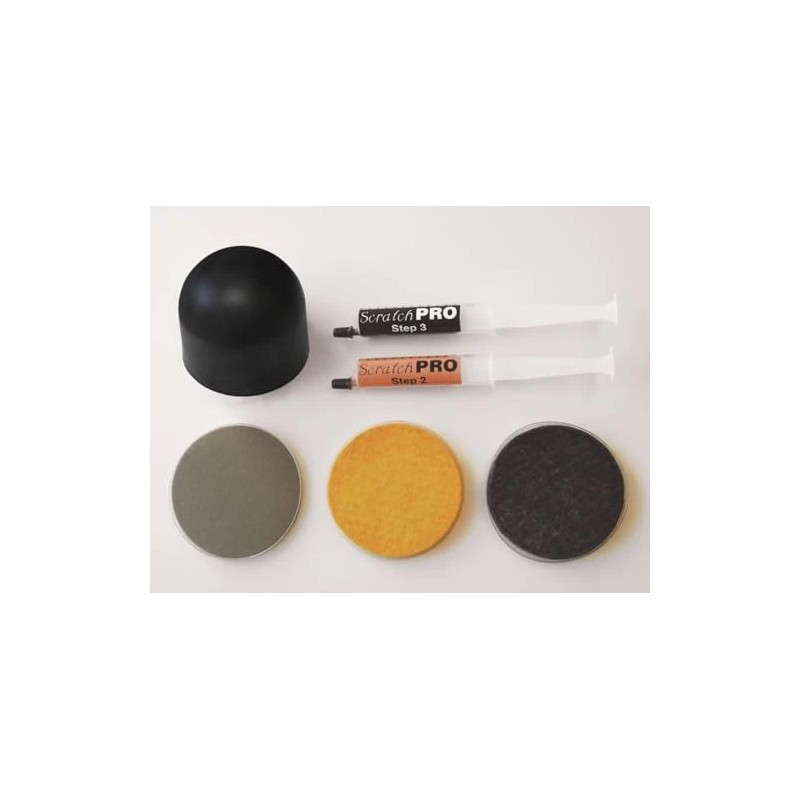 - 3 Step Scratch Repair: Step 1, Red for Scratch Removal; Step 2, Yellow for Buffing and Blending; Step 3, Grey for Polishing