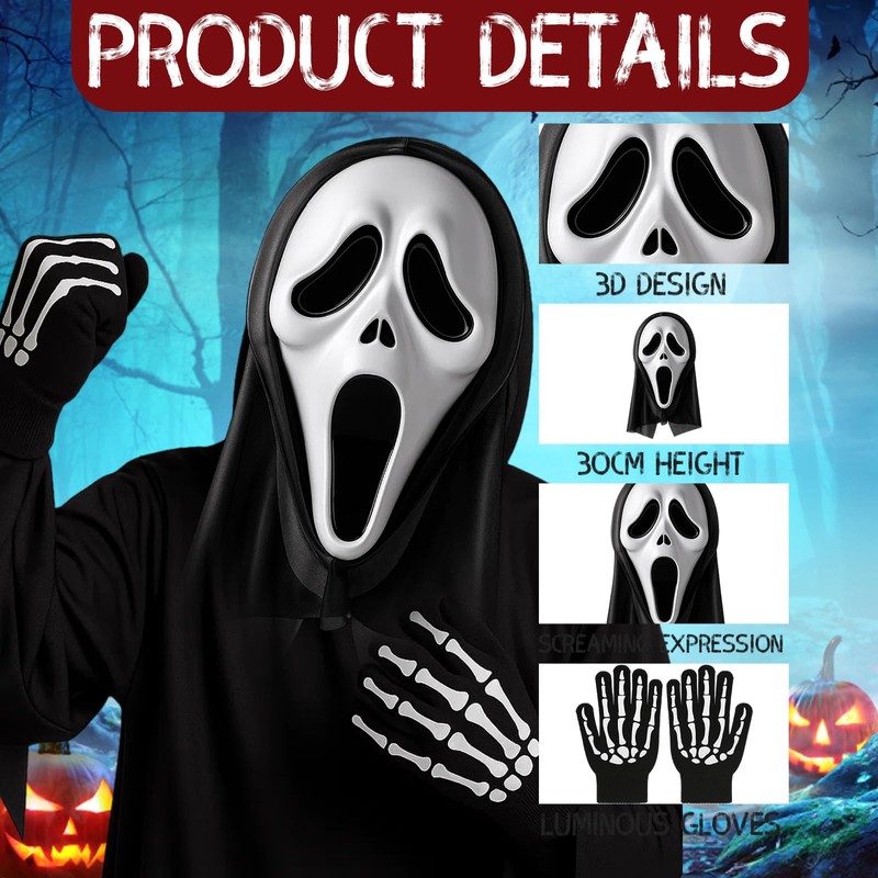 - Terrifying experience: with Scream costume set, you will be the centre of any party; the combination of Scream mask and ghost hand gloves ensures an authentic scary factor; ideal for horror fans and costume enthusiasts