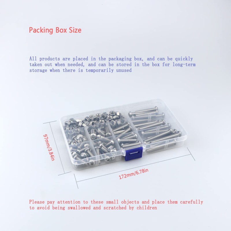 • High-quality materials: hex screws and nuts are made of high-quality 304 stainless steel with high hardness, corrosion resistance, robustness and durability. In harsh environments, they also have good rust resistance and excellent oxidation resistance to ensure product performance for a long service life